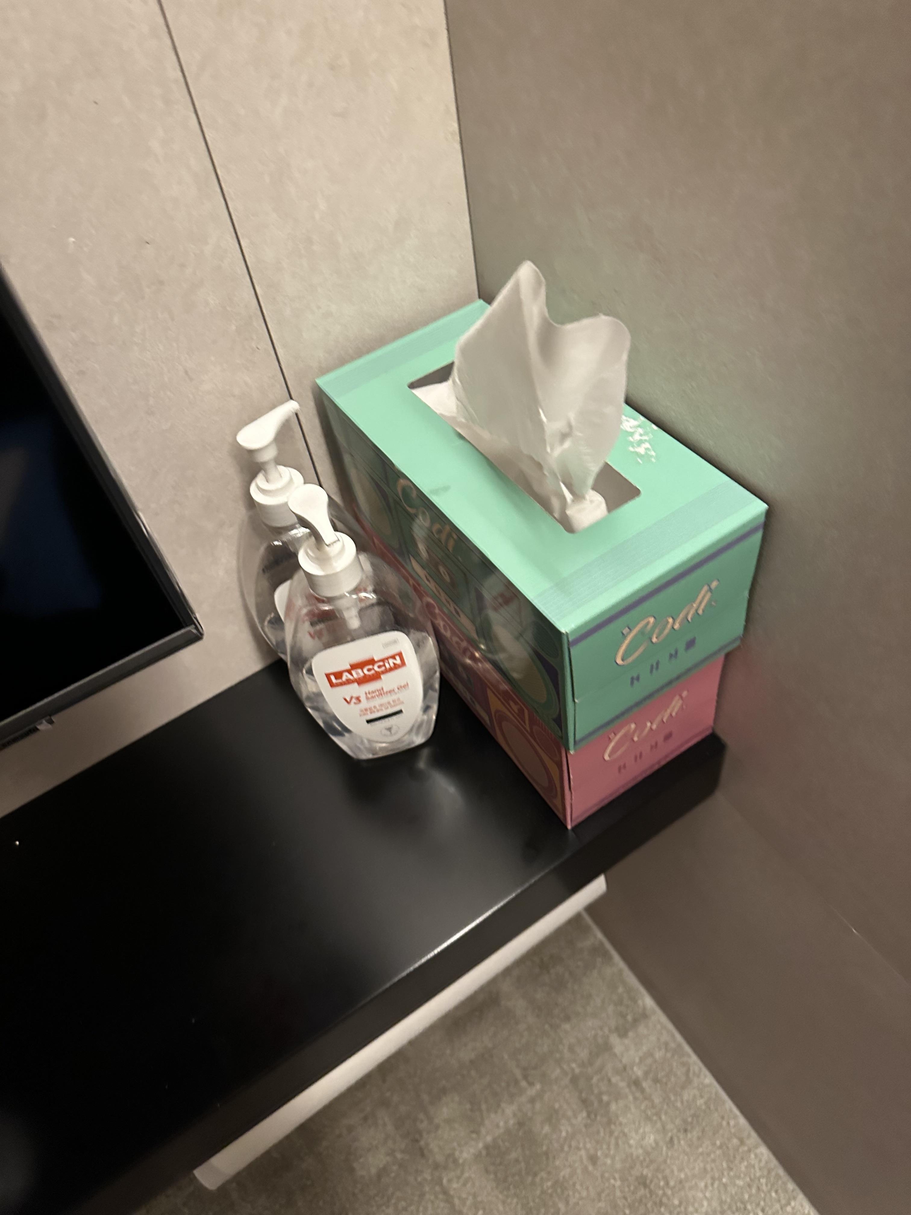 LCD TV와 휴지, 소독제와 페브리즈가 놓여있고